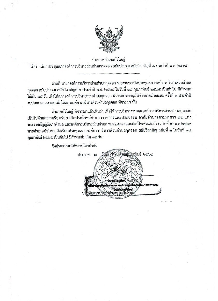 ประกาศอำเภอบัวใหญ่ เรื่องเรียกประชุมสภา สมัยวิสามัญ สมัยที่ ๑ ประจำปี ๒๕๖๕ |